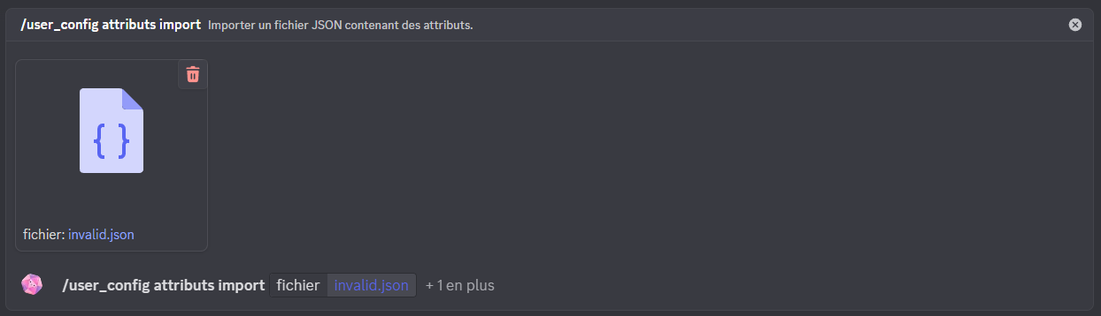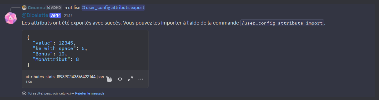 Importe des attributs à partir d’un fichier JSON. Cela permet de transférer ou partager facilement des données entre différents serveurs ou comptes.