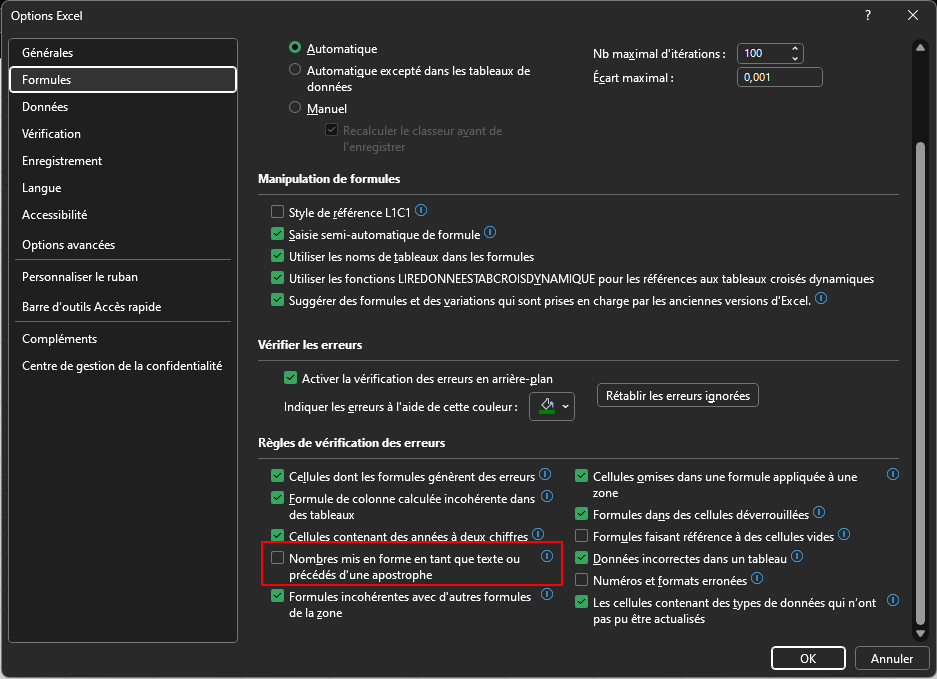 Et de désactiver la règle de vérification des erreurs "Nombres mis en forme en tant que texte ou précédés d'une apostrophe" dans les options de vérification des erreurs (Formules > Règle de vérification des erreurs) :